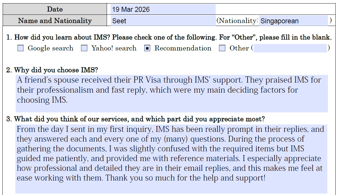 A: From the day I sent in my first inquiry, IMS has been really prompt in their replies, and they answered each and every one of my (many) questions. During the process of gathering the documents, I was slightly confused with the required items but IMS guided me patiently, and provided me with reference materials. I especially appreciate how professional and detailed they are in their email replies, and this makes me feel at ease working with them. Thank you so much for the help and support!