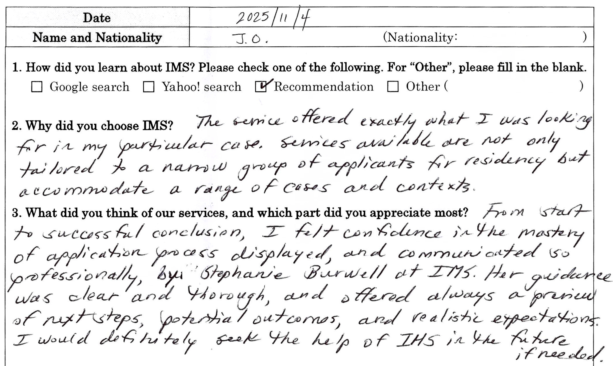 A: From start to successful conclusion, I felt confidence in the mastery of application process displayed, and communicated so professionally, by Stephanie Burwell at IMS. Her guidance was clear and thorough, and offered always a preview of next steps, potential outcomes, and realistic expectations. I would definitely seek the help of IMS in the future if needed.