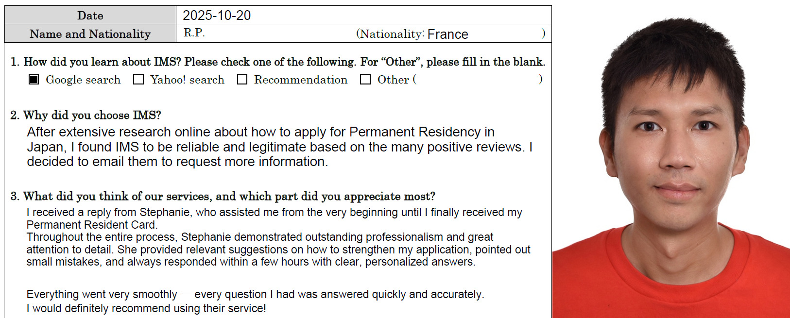 A: After extensive research online about how to apply for Permanent Residency in Japan, I found IMS to be reliable and legitimate based on the many positive reviews. I decided to email them to request more information.