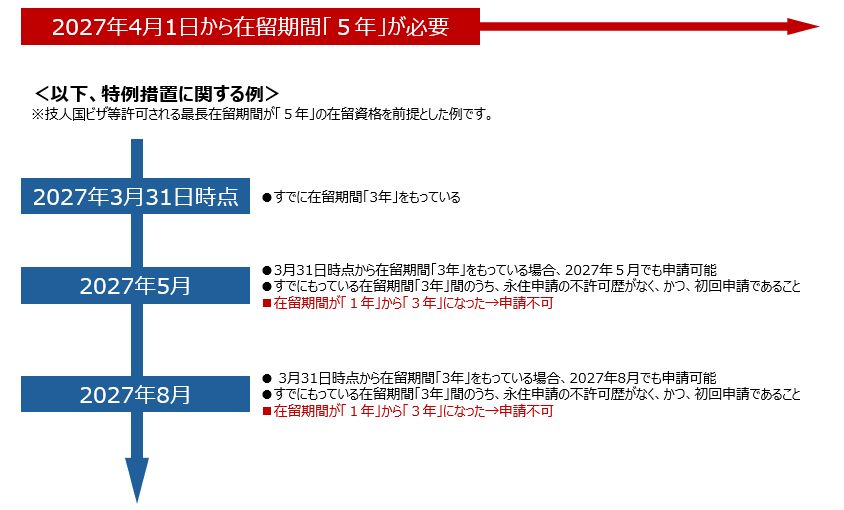 改定のポイントとしては、今まで在留期間「3年」を最長とみなす特例的な運用が終了することになりました。たとえば、技人国ビザの場合「5年、3年、1年又は3月」の在留期間があって、最長は「5年」ですが、今までは「3年」を持っている場合でも特例として要件を満たしていたのが、2027年4月1日以降の申請からは「5年」を持っていないと要件を満たさないことになります。つまり、今後は技人国ビザの場合、在留期間「3年」では要件を満たさなくなります。
