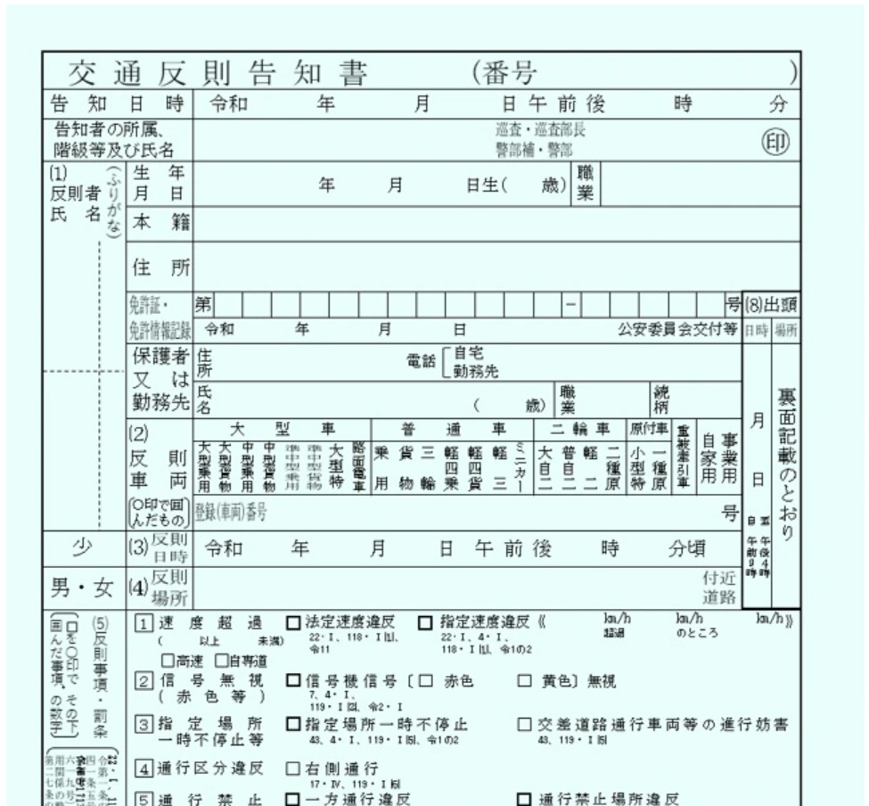 自動車を運転なさる方であれば、赤切符という言葉を聞いたことがある方が多いでしょう。赤切符とは比較的重い交通違反に対して切られる切符です(切符がピンク色なので俗に赤切符と呼ばれています。対して、青切符は上記のように水色の切符です)。こちらは無免許運転、ひき逃げ、大幅な速度超過、酒気帯び運転等の場合に交付されます。青切符との大きな違いは、刑事手続きに移行する点です。たかが交通違反といえど、略式命令による罰金が科されれば、それは「前科」となります。