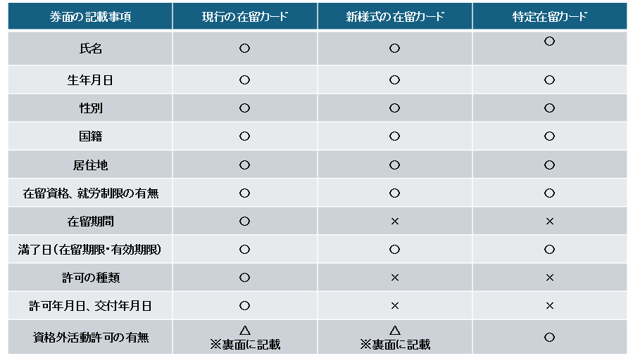 現行の在留カードと、新様式の在留カード」・特定在留カードの券面の記載内容について