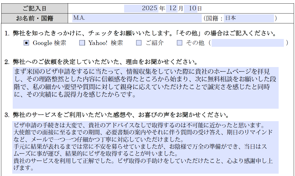 貴社のサービスを利用して正解でした。ビザ取得の手助けをしていただけたこと、心より感謝申し上げます。